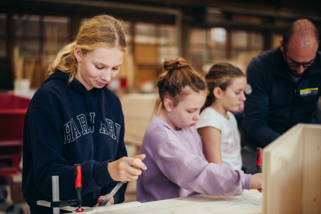 Es raspelt, hämmert, bohrt – dazwischen herrschte konzentrierte Stille. 10 Schülerinnen und 2 Schüler arbeiteten in der Produktionshalle von Stuberholz. Vollkommen konzentriert und mit sichtbarer Begeisterung widmeten sie sich ihren Werkstücken.