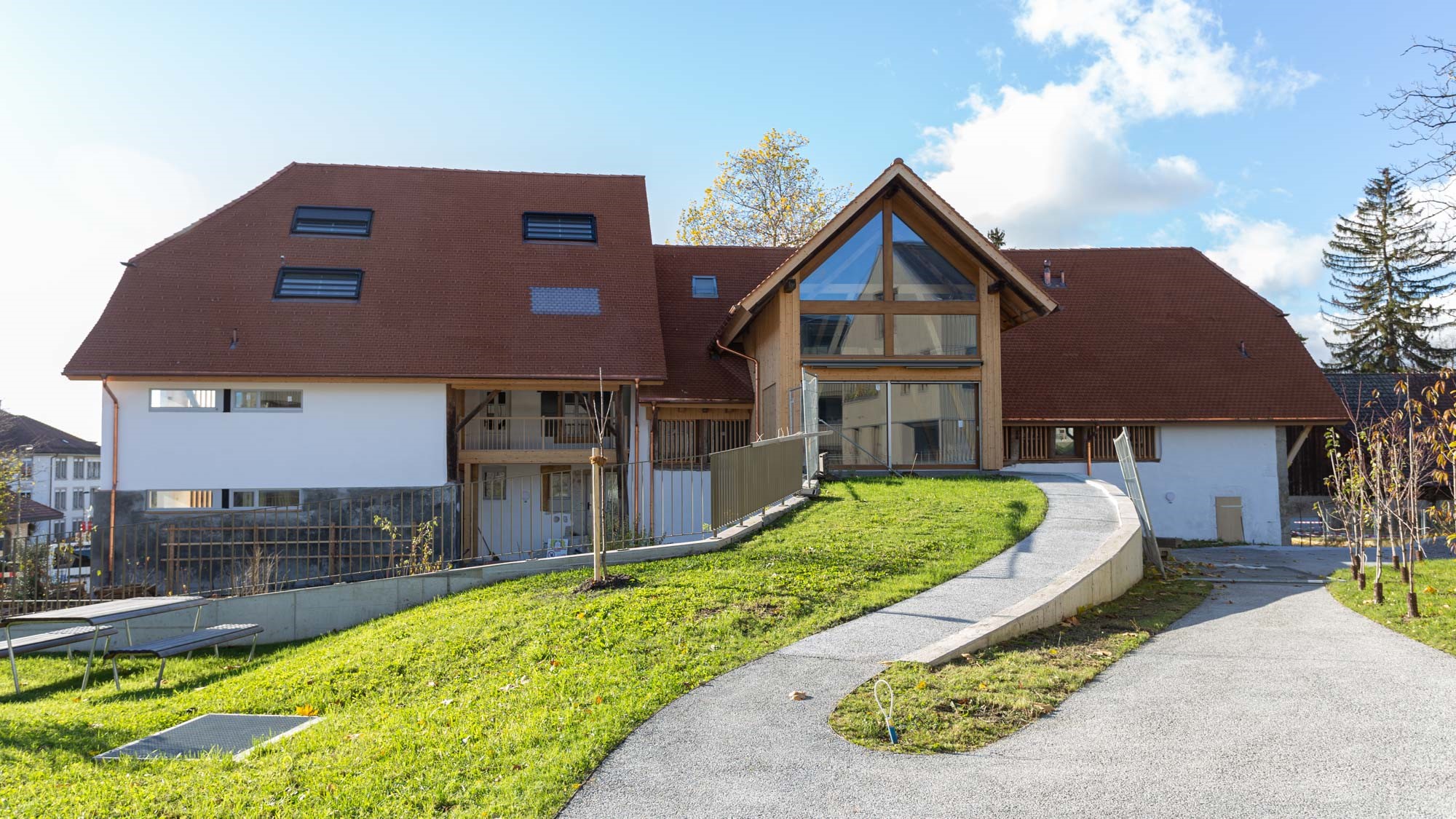 Zusätzlicher Wohnraum wurde im ehemaligen Ökonomieteil geschaffen. Um die denkmalgeschützte Fassade und das Dach des geschichtsträchtigen Baus zu erhalten, wurde das ehemalige Tenn vollständig ausgehöhlt und vor Ort ein Elementbau eingepasst. Alte Sparren und Balken im Dach blieben teilweise erhalten, und auch die historische Brandschutzmauer ist weiterhin sichtbar und trennt den ehemaligen Stallteil vom Wohnteil. Viel Fingerspitzengefühl war im Umgang mit filigranen Holzbauarbeiten gefragt. Nik Stuber betont: «Aufgrund des Denkmalschutzes war die klassische Zimmermannsarbeit besonders gefragt. Für unsere Zimmermänner war dies eine willkommene Gelegenheit, um ihre Handwerkskunst unter Beweis zu stellen.»