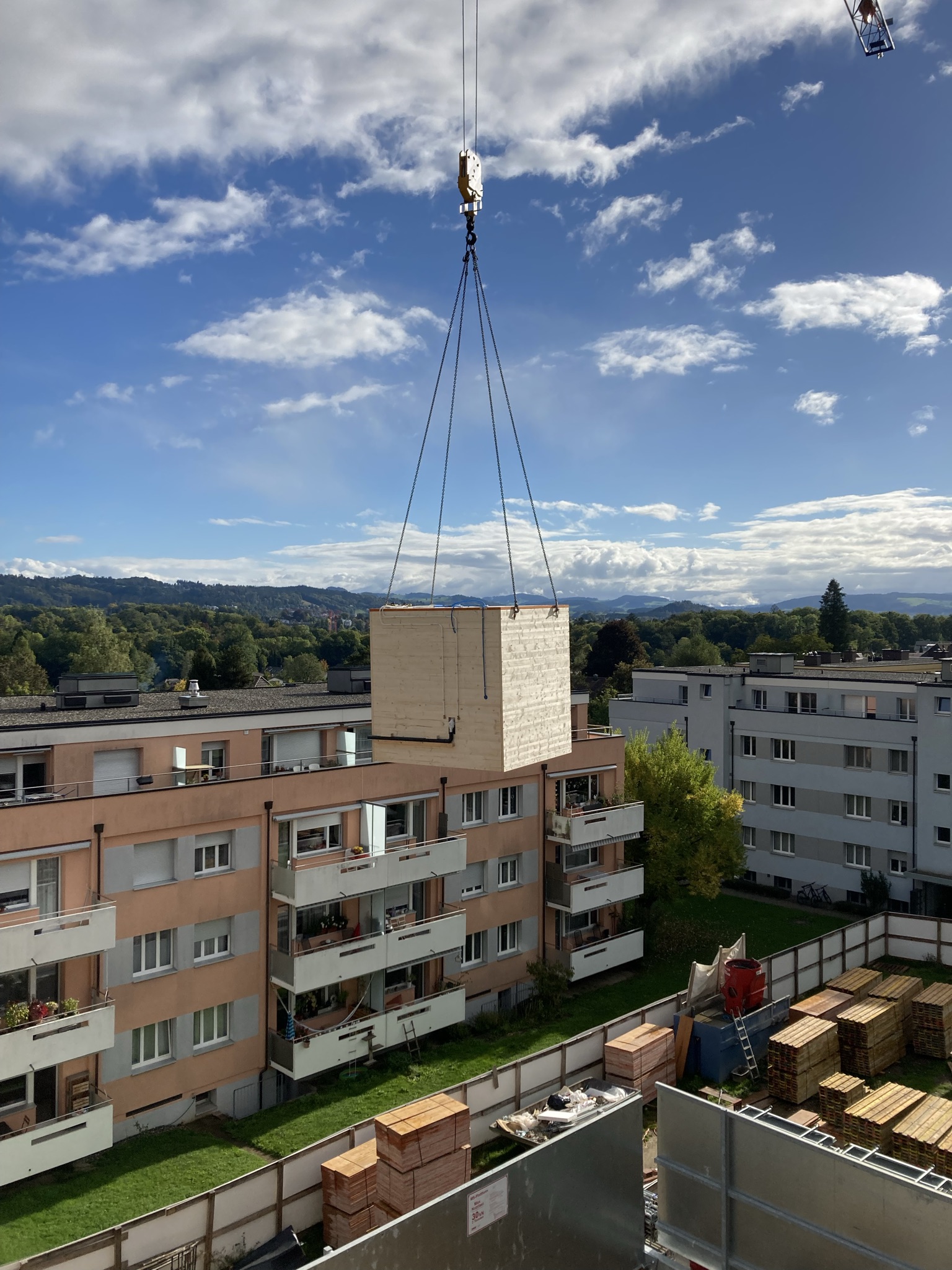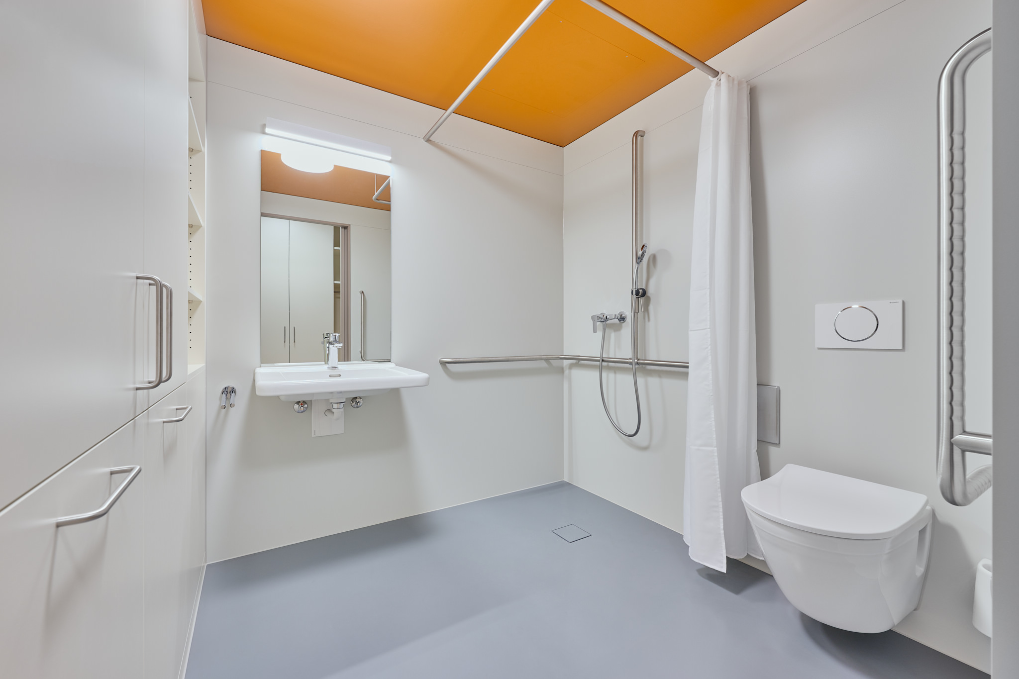 Der Neubau des Pflegeheims Grünau wird durch 77 IV Nasszellen in Holzbauweise ergänzt. Für die Wandbeläge wurden Volkernplatten und für die Böden Glasfaser-Kunststoff gewählt. Einbauschränke (beschichtet) für zusätzlichen Stauraum komplettieren die Zelle. Modulbäder werden als Raummodul komplett im Werk vorgefertigt und beim Aufrichten des Gebäudes eingesetzt.