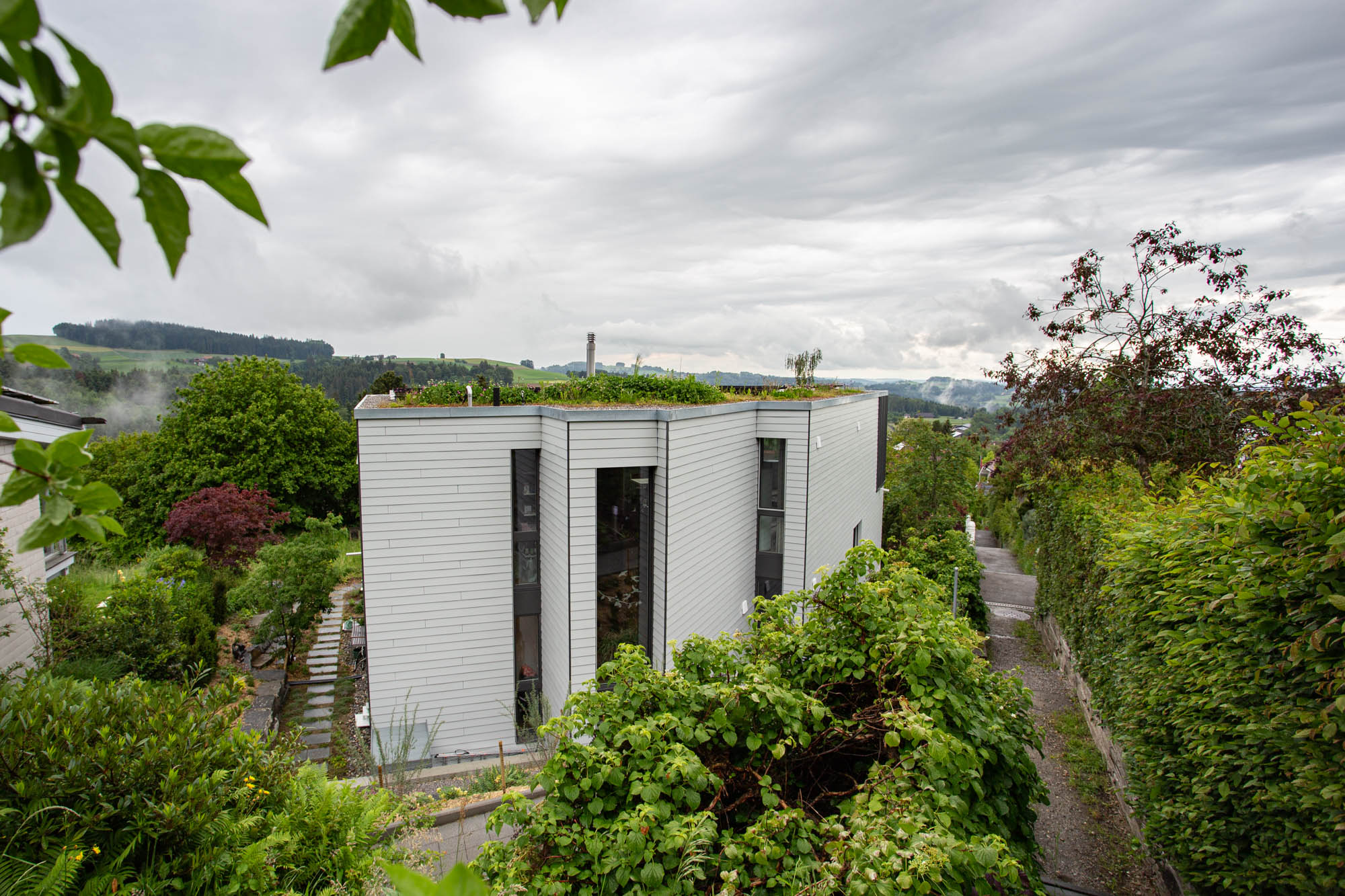 Neubau eines Einfamilienhauses in Holzelementbauweise mit aussergewöhnlichem Grundriss und grosser Hebeschieberfront im Wohnbereich. Im Innenausbau wurden eine Küche mit Antifingerprint Fenix, sowie Schränke und Badezimmermöbel erstellt.