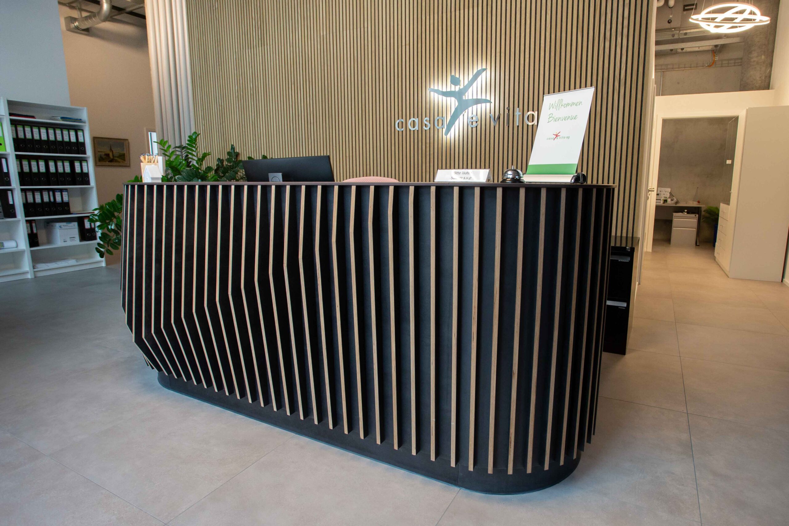 Für den Empfang der Firma Casa e Vita realisierte Stuberholz eine Theke aus Eiche, furniert mit schwarzem Filz und einer Rückwand mit Akustik-Täfer. Die Teeküche überzeugt durch Kunstharzfronten, Keramikabdeckung und Quooker.