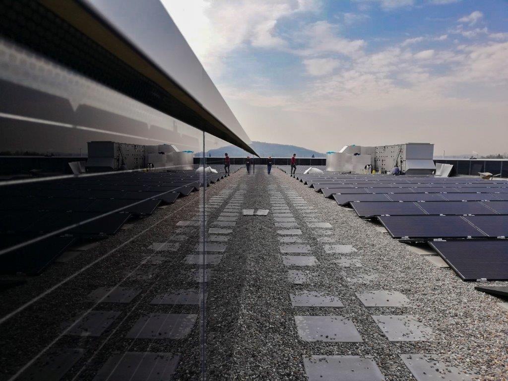 Der Gewerbebau K3 ist von Kopf bis Fuss eingekleidet mit Solarpanelen und kann damit seinen Energiebedarf grösstenteils selber produzieren. Das Gewerbehaus bezieht einen Grossteil des Stroms für die Raumwärme und die Raumkühlung aus seiner 3'800 Quadratmeter grossen Solaranlage auf dem Dach und an seinen Fassaden. Die Solaranlage, beinahe so gross wie ein Fussballfeld, ist Schweizer Rekord. Stuberholz montierte die Unterkonstruktion für die Solarpanele im Werk vor und hängte die Module auf der Baustelle ein.